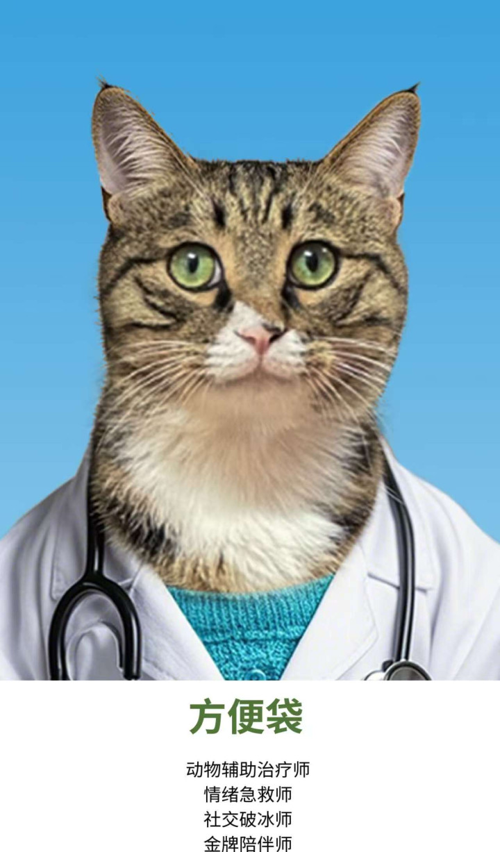 在济南智善心理医院(下称“智善心理”),“医疗专家团”介绍栏的首位是一张穿着白大褂的狸花猫照片。这只名为“方便袋”的猫,被称作“方医生”兆富配资,头衔是动物辅助治疗师、情绪急救师、社交破冰师和金牌陪伴师。院长、资深咨询师的介绍排在其后。