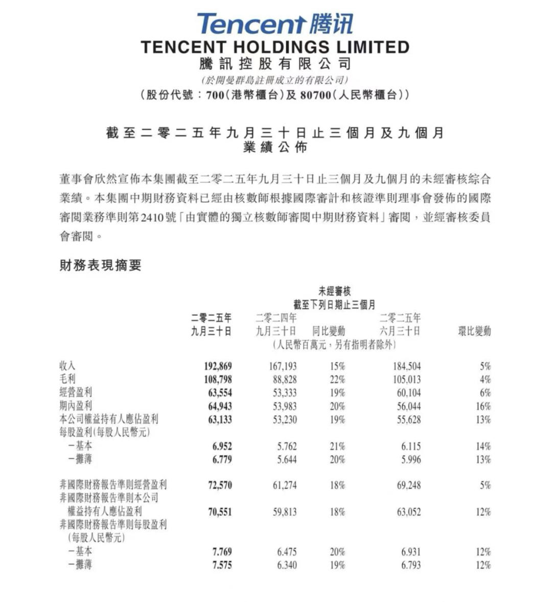 2025年第三季度财报显示,腾讯在金融科技及企业服务方面收入同比提高10%