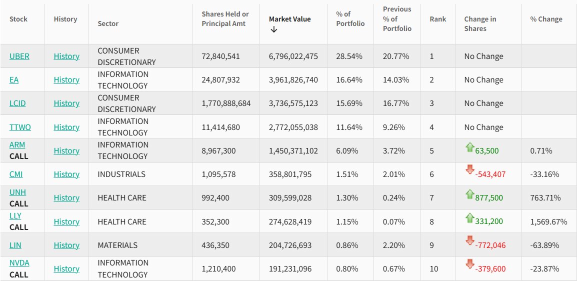 在前五大重仓股中,优步(UBER.US)位列第一,持仓约7284万股,持仓市值约为68亿美元,占投资组合比例为28.54%,与上季度持仓数量持平。
