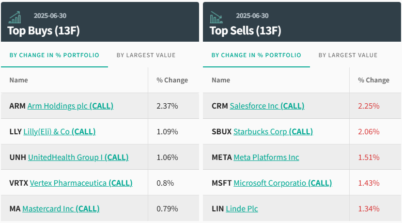 从持仓比例变化来看,前五大买入标的分别是:Arm看涨期权、礼来看涨期权(LLY.US,CALL)、联合健康看涨期权(UNH.US,CALL)、福泰制药看涨期权(VRTX.US,CALL)、万事达看涨期权(MA.US,CALL)。